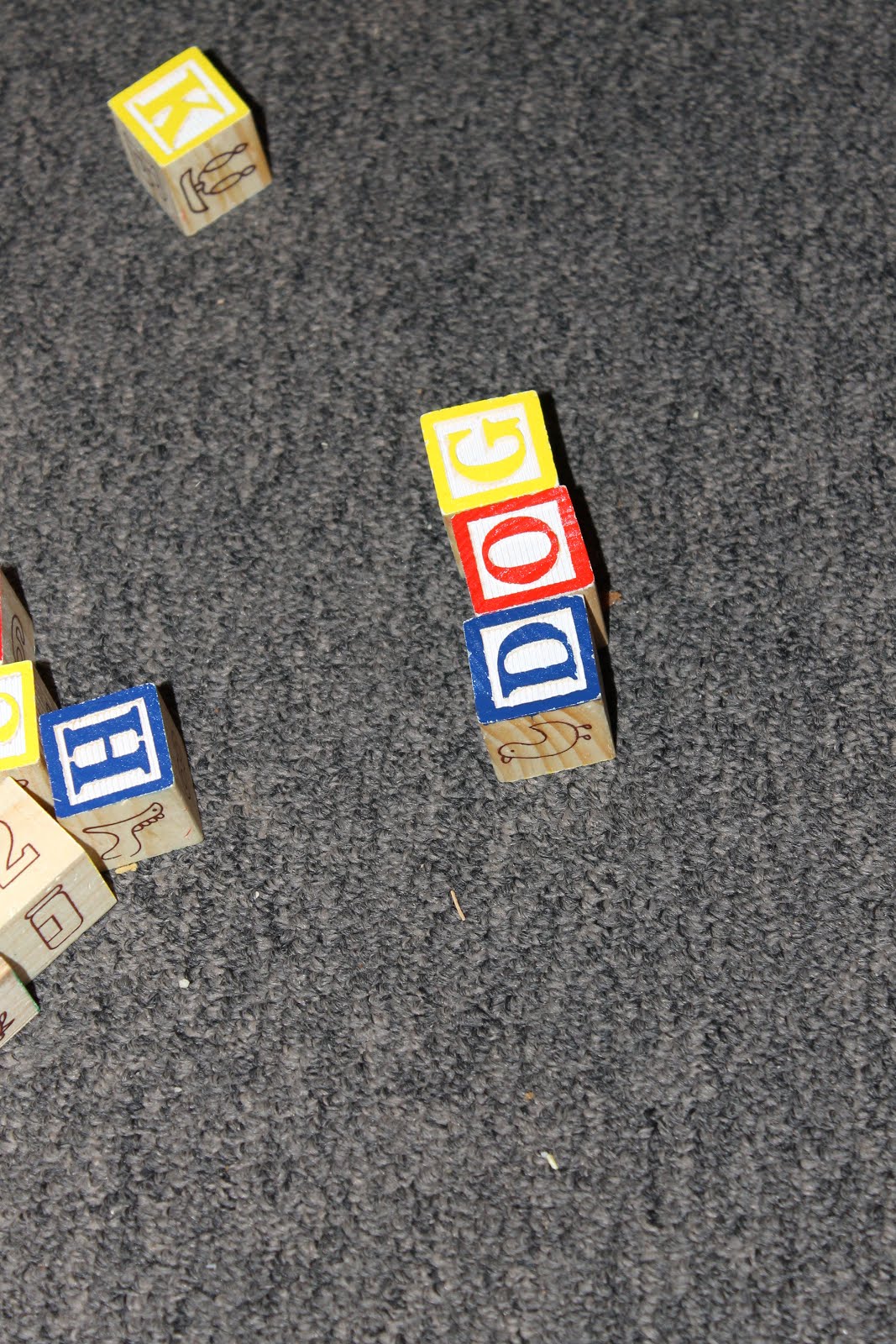 Daddy and I decided to build some words like they do in Word World. I know how to spell "dog" so using my blocks I made the word.